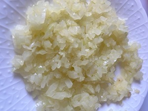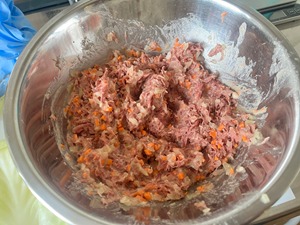 大容量特製コンビーフに、みじん切りにした玉ねぎ・にんじん・キャベツの芯を加えます。