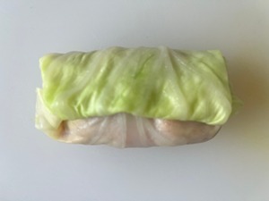 キャベツの葉にタネをのせ、その上にチーズを置き優しく包む。