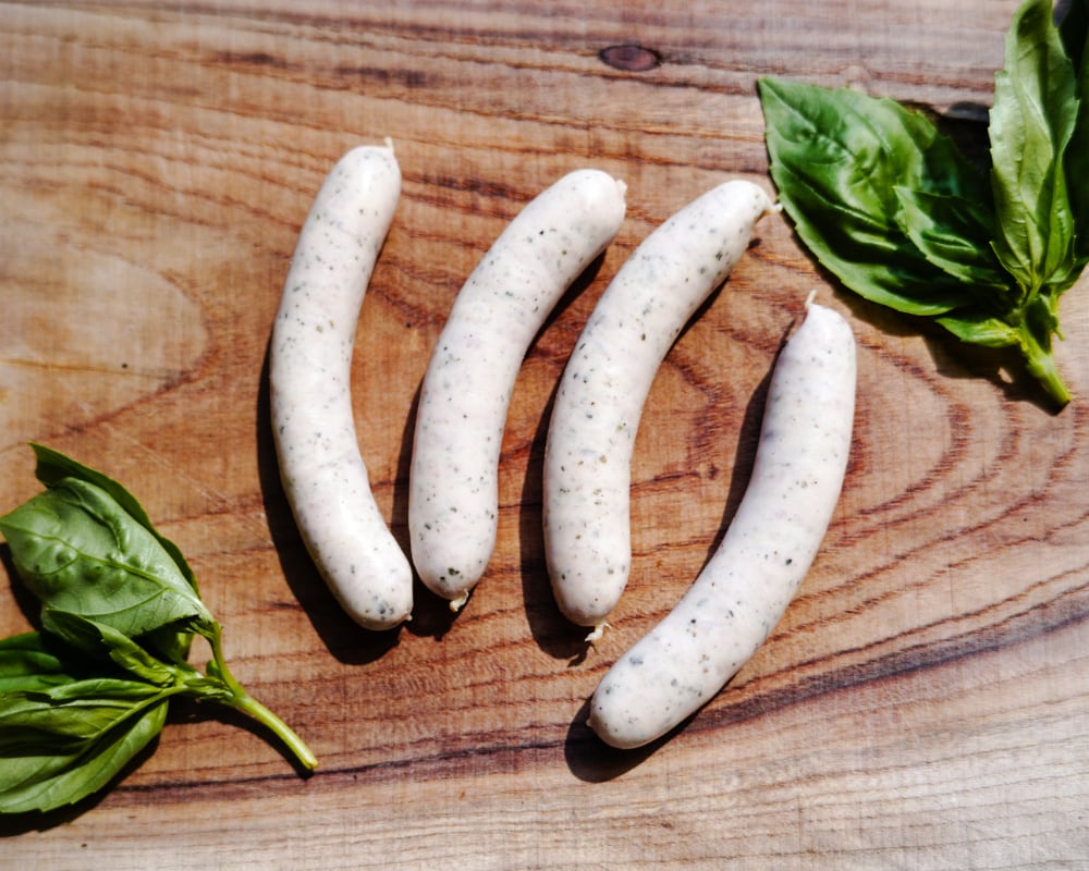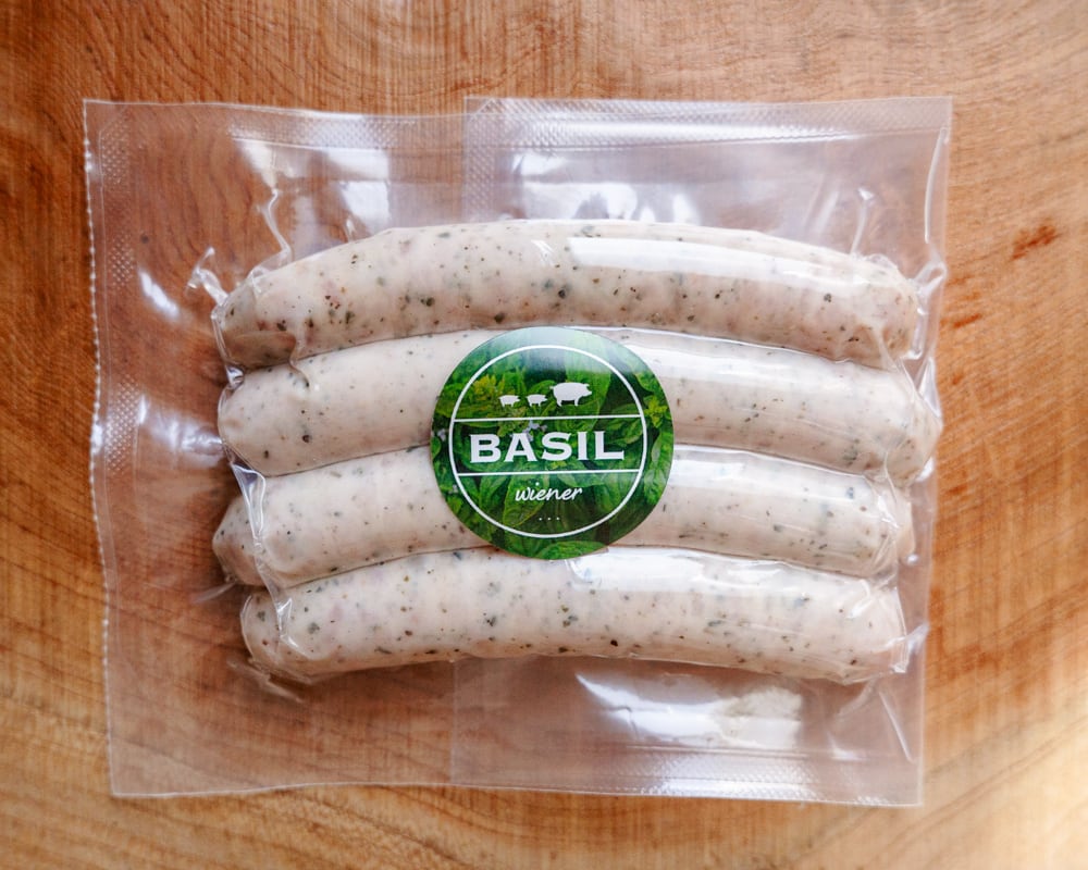国産豚の旨みを活かした粗挽きウインナーに、バジルの爽やかな香りを重ねた一品です。