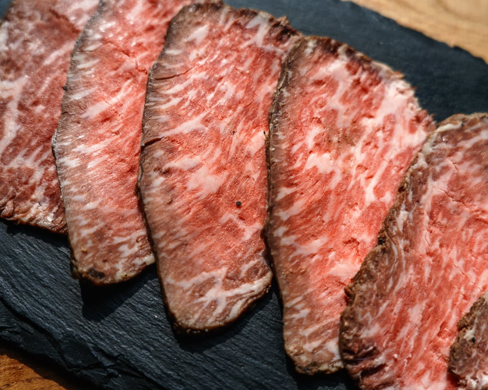 国内最上級の和牛『松阪牛』の赤身を原料に、時間をかけ低温でじっくり焼きあげました。お肉の中心から広がる淡いピンクの肉色が低温で焼き上げたあかしです。日本一と言われる『松阪牛』で作ったローストビーフの最高級の味をご堪能ください。余計なものは一切入れない無添加ですので、雑味のないお肉本来の美味しさです。少量の塩やわさびでお召し上がりいただくのがおすすめです。