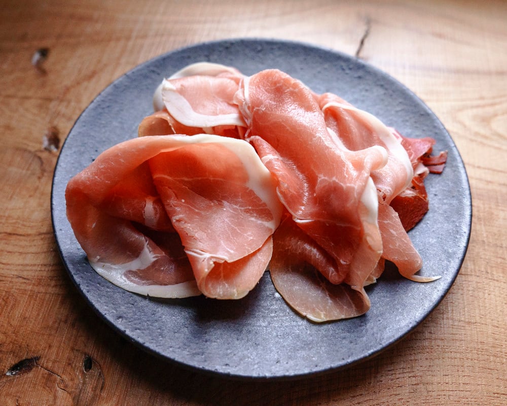 ほどよい塩味で口当たりが良いポルトガル産プロシュートを是非ご賞味ください。